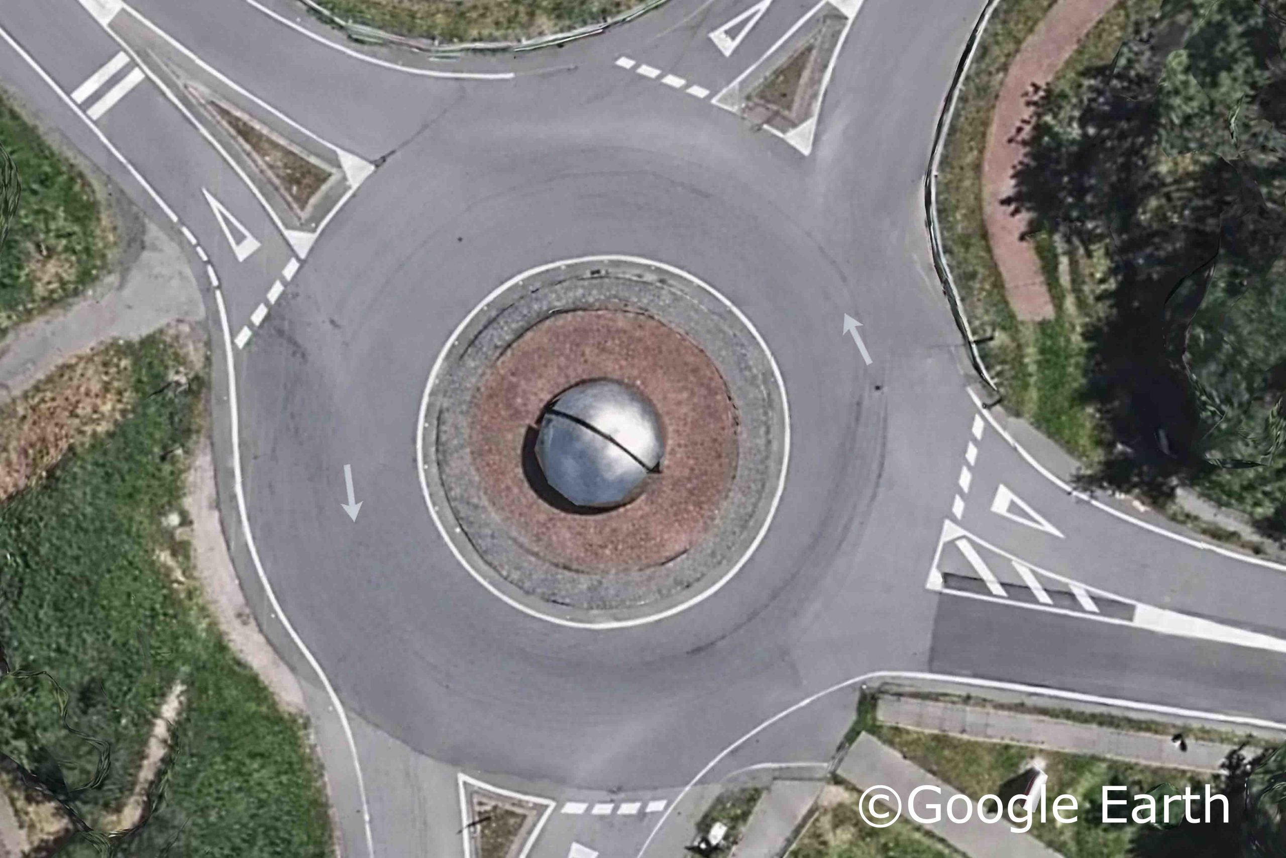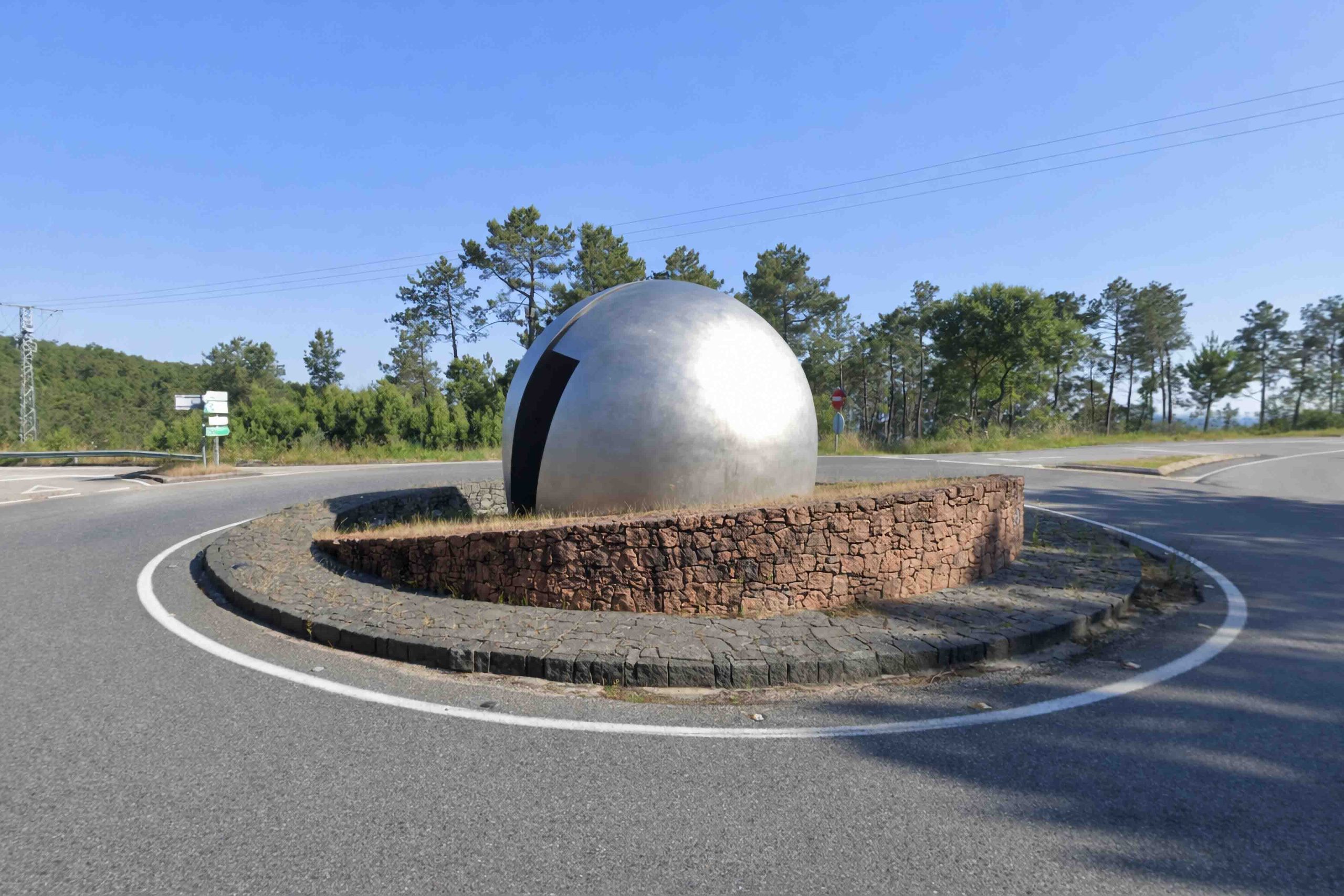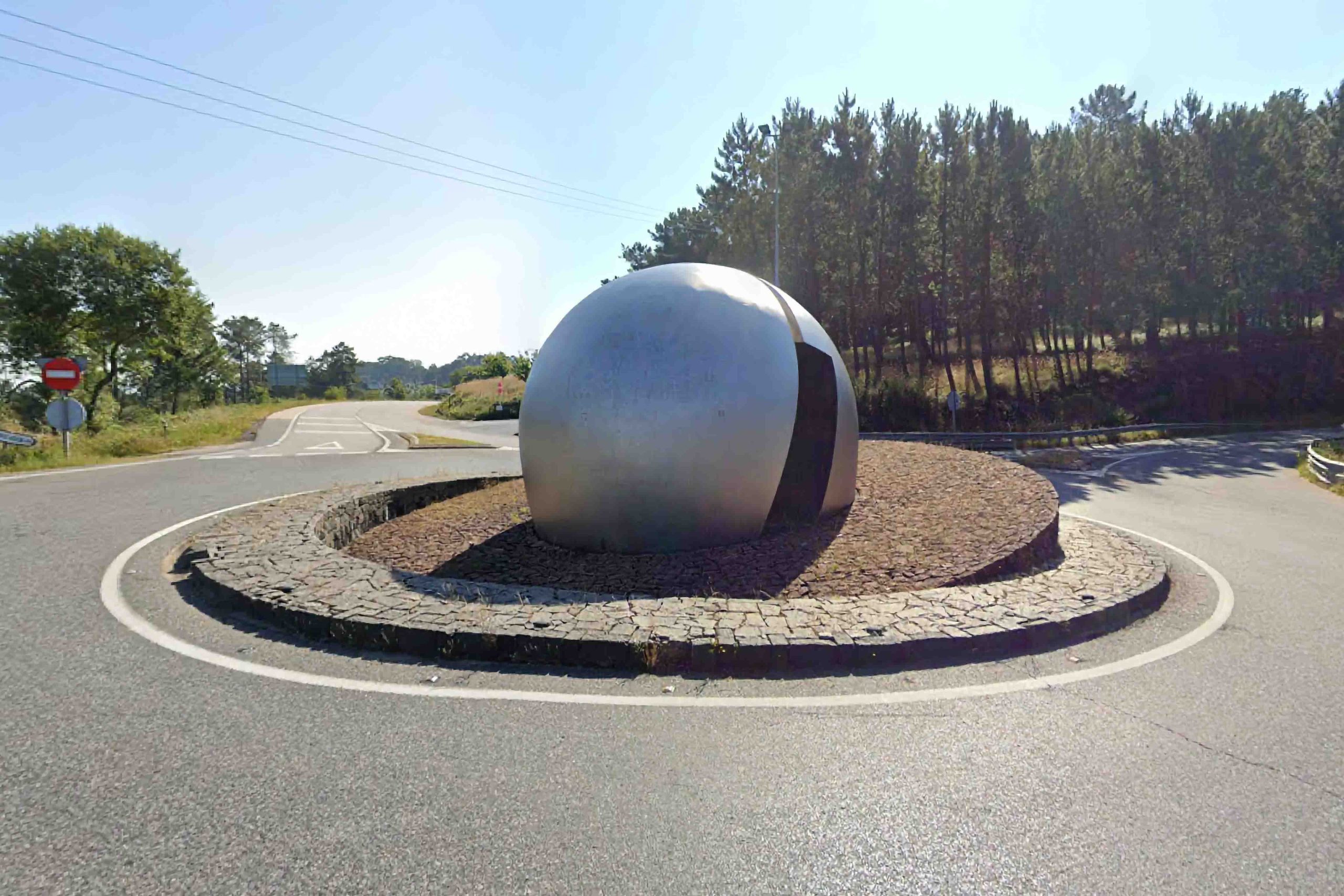 A escultura articúlase a partir de dous círculos concéntricos de cachotaría: o primeiro, de tonalidade gris, paralelo ao chan; o segundo, de cor rosada, lixeiramente inclinado respecto do plano horizontal. Sobre esta base emerxen e, ao mesmo tempo, semellan afundirse dúas semiesferas de aceiro inoxidable, separadas por un oco rectangular disposto nunha diagonal oposta á inclinación do plano de apoio. Este corte diagonal non só fragmenta a esfera, senón que permite ver o seu interior e, a través del, o espazo que se estende máis alá, establecendo unha relación directa entre a obra, o contorno e o público espectador.